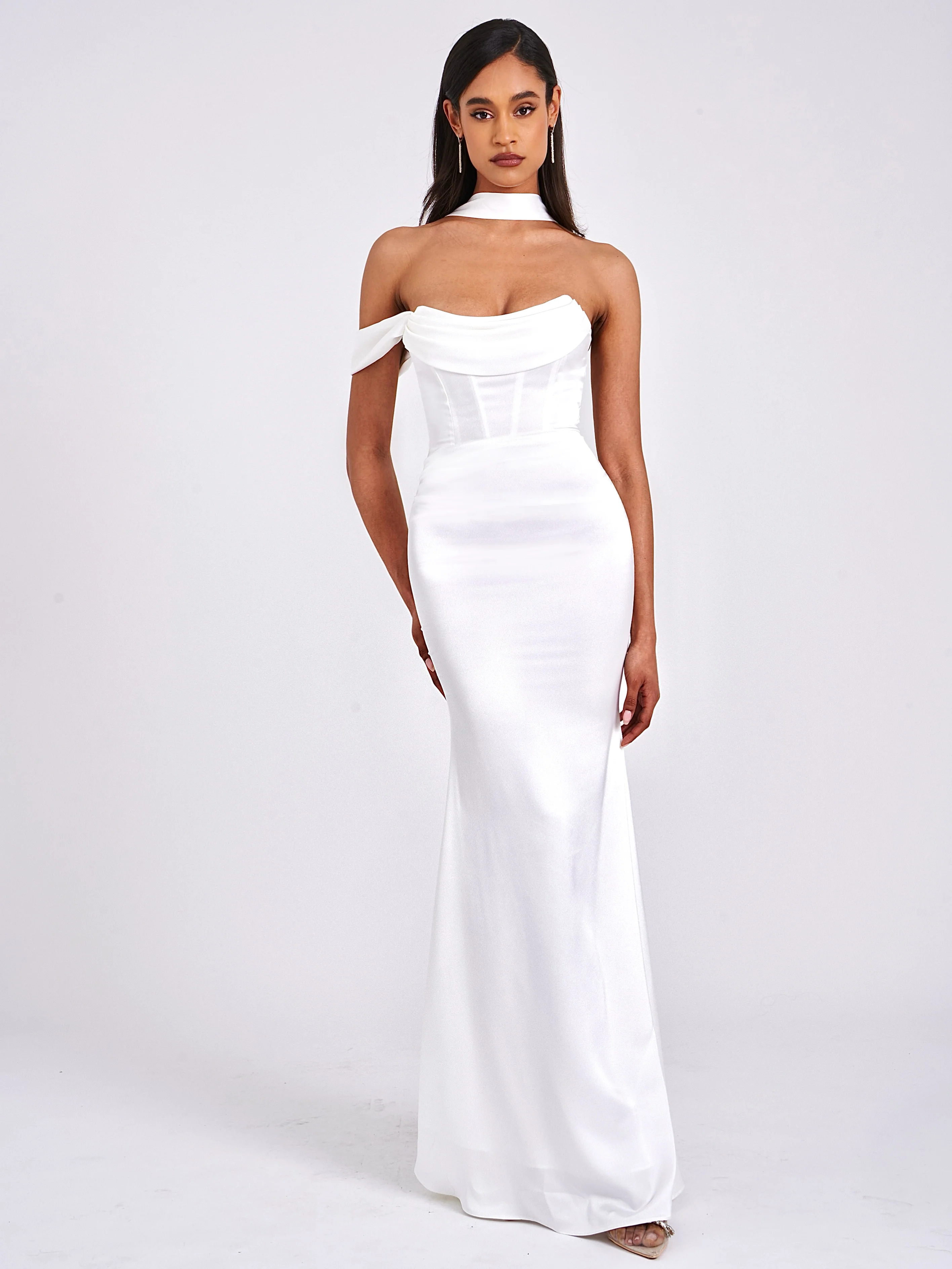 Ivona White Halter Neck Double Duchess Satin Gown